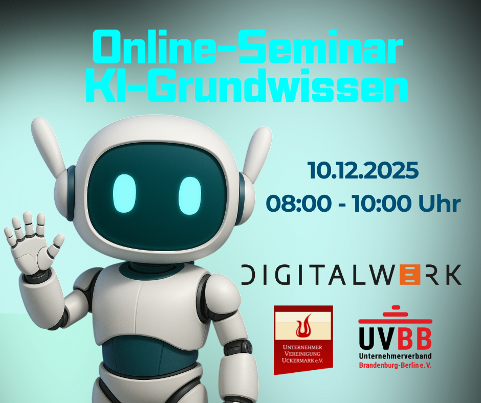 Gemeinsam mit dem Digitalwerk Werder und dem Unternehmerverband Brandenburg Berlin bieten wir ein kompaktes Online-Seminar an, das einen strukturierten und verständlichen Überblick über moderne Technologien der Künstlichen Intelligenz vermittelt. Das Angebot richtet sich an Einsteigerinnen und Einsteiger, die KI besser verstehen und erste praktische Anwendungsmöglichkeiten kennenlernen möchten.