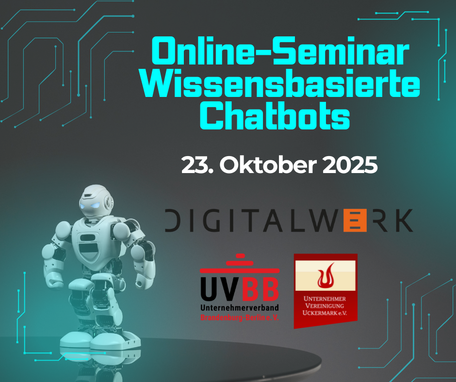 Das Digitalwerk Werder lädt in Kooperation mit der Unternehmervereinigung Uckermark e.V. und dem Unternehmerverband Brandenburg-Berlin e.V. zum kostenfreien Online-Seminar „Wissensbasierte Chatbots für die eigene Website“ ein.
